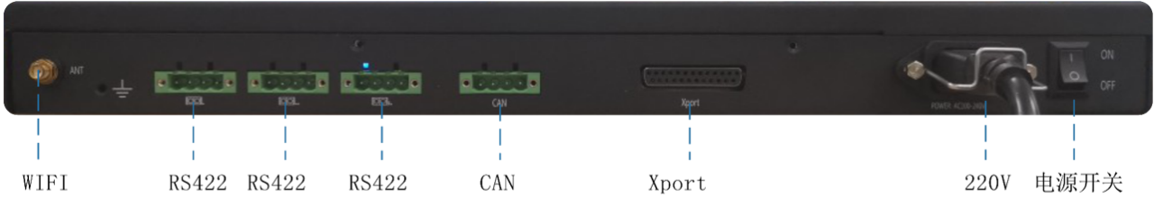 WIFI:WIFI天线接口 RS422:RS422通信接口 CAN:CAN通信接口 220v交流电源接口 电源开关:ON(开机)、OFF(关机)
