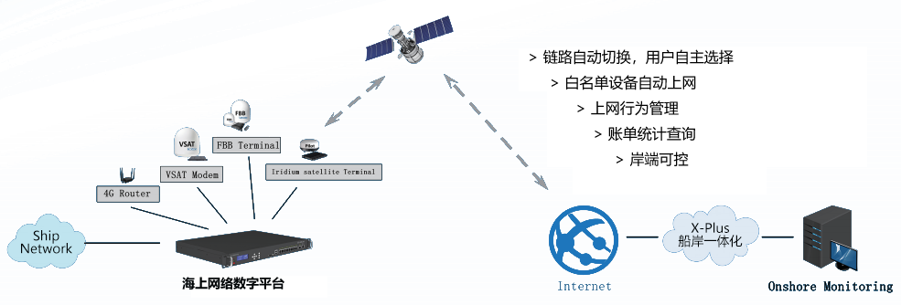 海上网络数字平台 加强船舶网络使用的监控和管理 保障网络可用性和经济型 海上网络数字平台是管理船舶通信的多功能网关,在船舶端,上接通信设备,下连船舶网络,集中为船舶提供网络通信服务,能够更有序、更安全、更有效的利用通信链路。 平台提供了基于用户管理、上网账号管理、上网记录、行为管理和上网路由(VSAT、4G/5G、FBB、Iridium等)管理服务,有效加强船舶网络使用的监控和管理,保障网络可用性和经济性。