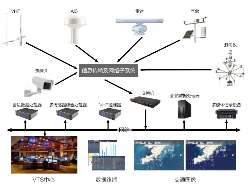 系统组成 雷达子系统、雷达信号处理子系统、多传感融合处理服务子系统、交通显控子系统,记录回放子系统、甚高频通信子系统、船舶管理信息子系统(DBMIS)、AIS子系统、水文气象子系统、CCTV子系统、测向子系统、信息交换子系统、网络子系统。 系统架构