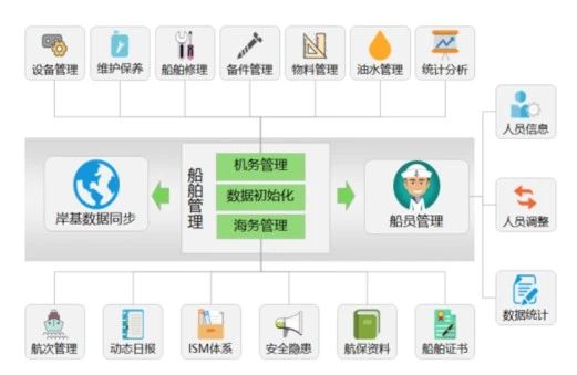 系统主要功能 经营管理系统:保险管理、客户管理、货盘管理、租船信息、合同管理、船盘管理; 机务管理系统:设备管理、维护保养、修理管理、备件管理、物料管理、燃油管理、滑油管理、淡水管理、化学试剂管理、能效管理; 海务管理系统:航次管理、证书管理、安全管理、体系文件、动态日报、航海通告管理、 图书管理、海图管理、法律公约; 采购管理系统:采购系统配置、供应商管理、报价管理; 人事管理系统:船员管理、船员调配、人员信息、人员聘用管理、考核与奖惩、工资基础数据、陆上人员工资、工资配置、船员工资、工资报表、培训管理、合同管理、证书管理; 费用管理系统:科目管理、费用项目、凭证管理、报文管理、SAP映射管理、费用统计、年度预算; 辅助决策系统:能效管理、价值分析、航次分析、综合统计分析;