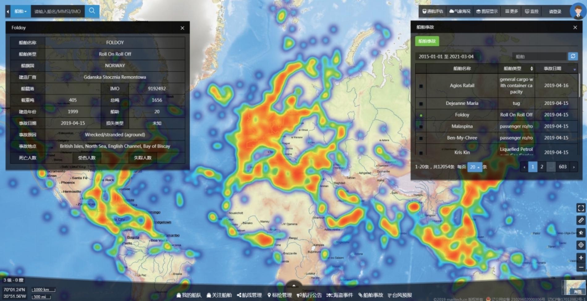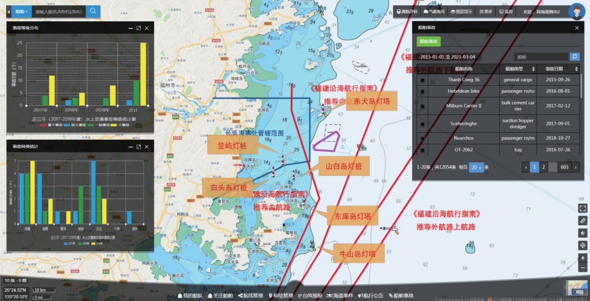 如航行安全、事故分析等,从船舶安全角度出发,提供分析指定区域、指定时段的船舶会遇、事故发生情况等典型海上交通特征的统计与分析。