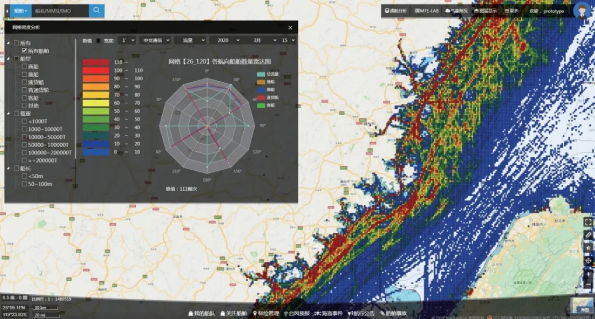 如航道规划、船舶分布等,从实际业务需要出发,划定分析区域及时段,提供如船舶航迹、船舶密度、航速分布等典型区域交通特征分析服务。