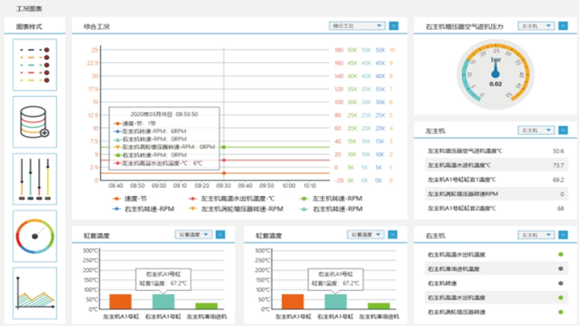 图形化的航行动态显示: 平台提供图形化的航行动态信息显示,包括CONNING、MIMIC图、船舶工况等,方便用户快捷掌握船舶各种实时航行动态,航行动态、机舱报警、船舶工况可视化显示;丰富的可视化数据展示效果;一种数据多种图形展示;一张图进行多种数据的实时变化对比;用户个性化设定显示方式;