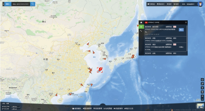 多方位的航行安全监控: 平台对船舶航行过程进行全方位的监控,包括航行状态监控、碰撞监控、锚泊监控、航线监控、气象监控和区域监控等,及时反馈可能的危险警告;