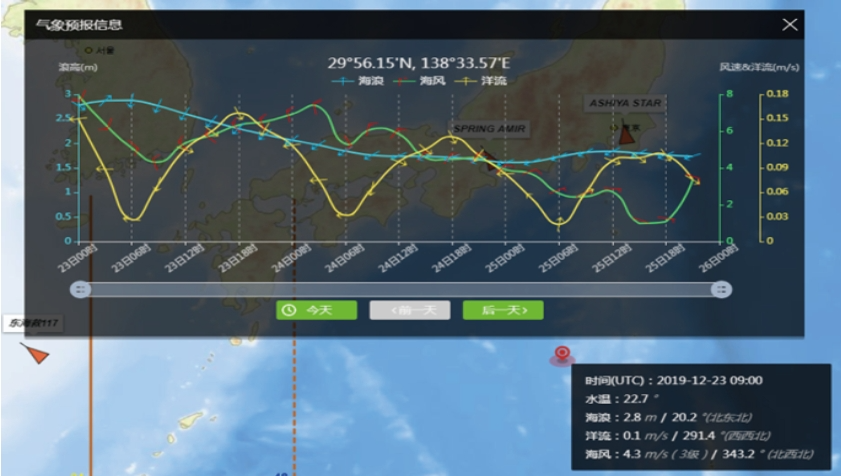 全面及时的海域态势信息: 提供覆盖全球的AIS数据服务,以及海盗事件、航行警告和通告等及时的海域态势相关信息,当对船舶航行安全存在威胁时及时提醒,对海域态势信息提供多种角度的统计分析,可视化显示海域态势信息; 丰富的全球气象海况预报: 平台提供权威部门发布的气象海况预报元素,包括台风、水温、洋流、海风、海浪、海冰、降雨量、能见度等,气象预报信息切片化显示,矢量化信息服务;多颗粒度气象预报元素,实现多维度掌握海域气象;高密度网格气象预报,预报数据更加准确可信;任意时空气象信息查询,掌握公司船舶当下的气象状况;任意位置气象预报可视化,掌握未来气象变化趋势。