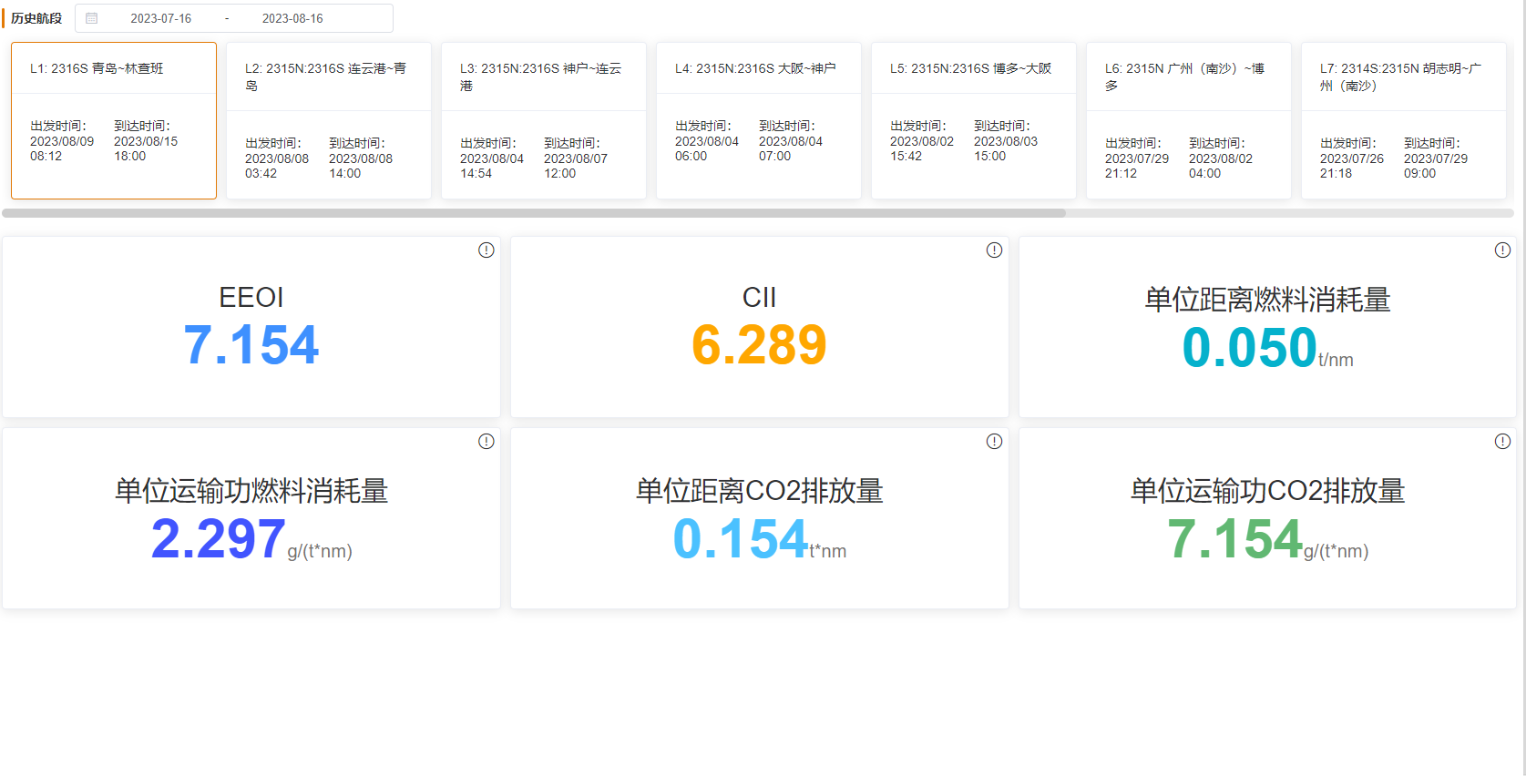 船舶能效总览: 针对于CCS的智能能效E,提供能效报告,可查询计算航段的EEOI、CII、单位距离燃料消耗、单位运输功燃料消耗量、单位距离CO2排放量、单位运输功CO2排放量。