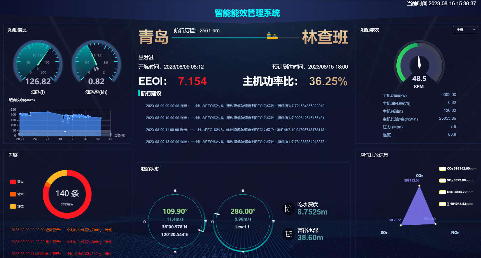 船舶能效总览: 船舶能效数据总览主要展示能效及排放指标信息,以曲线和航线地图形式进行展示,提供针对能效的航行建议、针对能耗的航行警告等。使用质量流量计实现在线监控船舶主机、发电机、锅炉的耗油量。