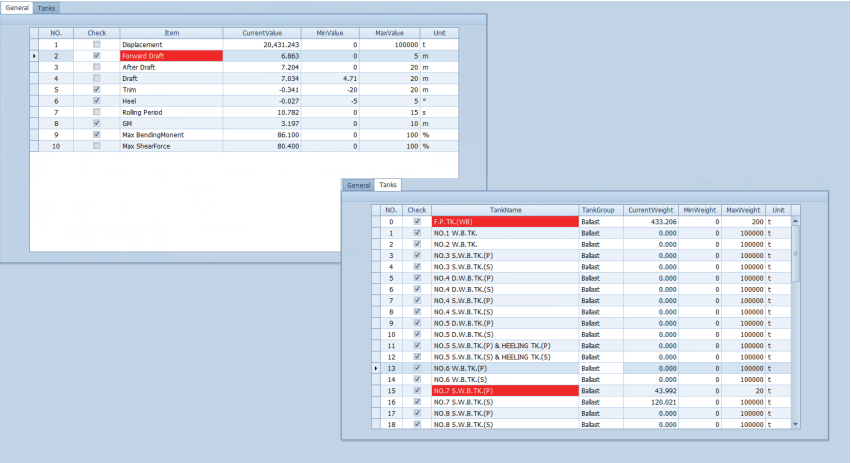 用户自定义报警模块: 用户可根据需求定义报警点,可以选择船舶浮态、稳性和强度参数,也可以对所关注的舱室进行监控,满足客户的定制化报警需求。
