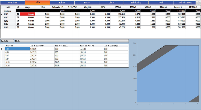 干散货/多用途管理模块: 适用于散货船、多用途船的干散货配载,用户可以自定义舱室的类型和货物的种类,甲板货、钢卷、木材装载及谷物装载及校核。
