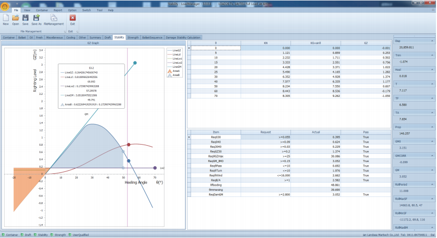 稳性计算模块: 包括完整稳性的计算与校核,散装谷物稳性计算与校核,损失浮力法计算破舱稳性。