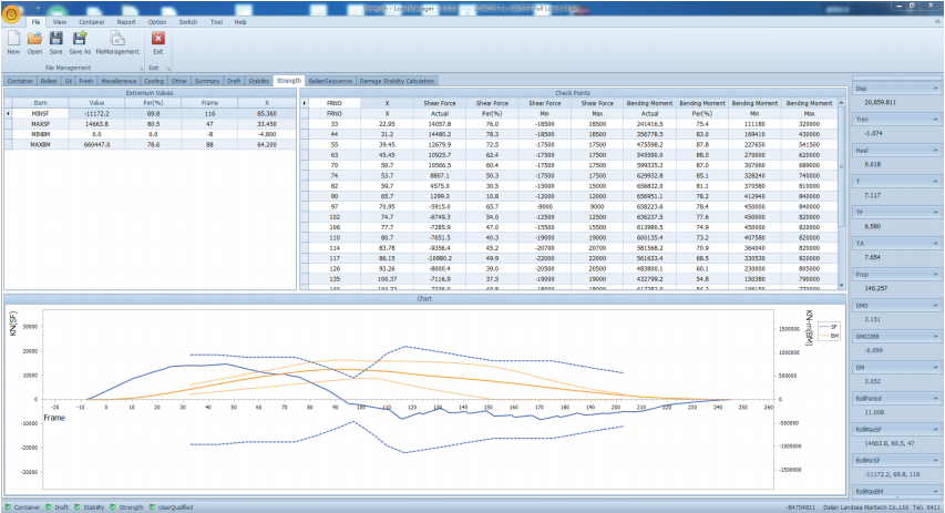 强度计算模块: 船舶总纵强度计算,典型肋位处的剪力和弯矩计算,极限强度计算和校核,图形化显示计算结果。